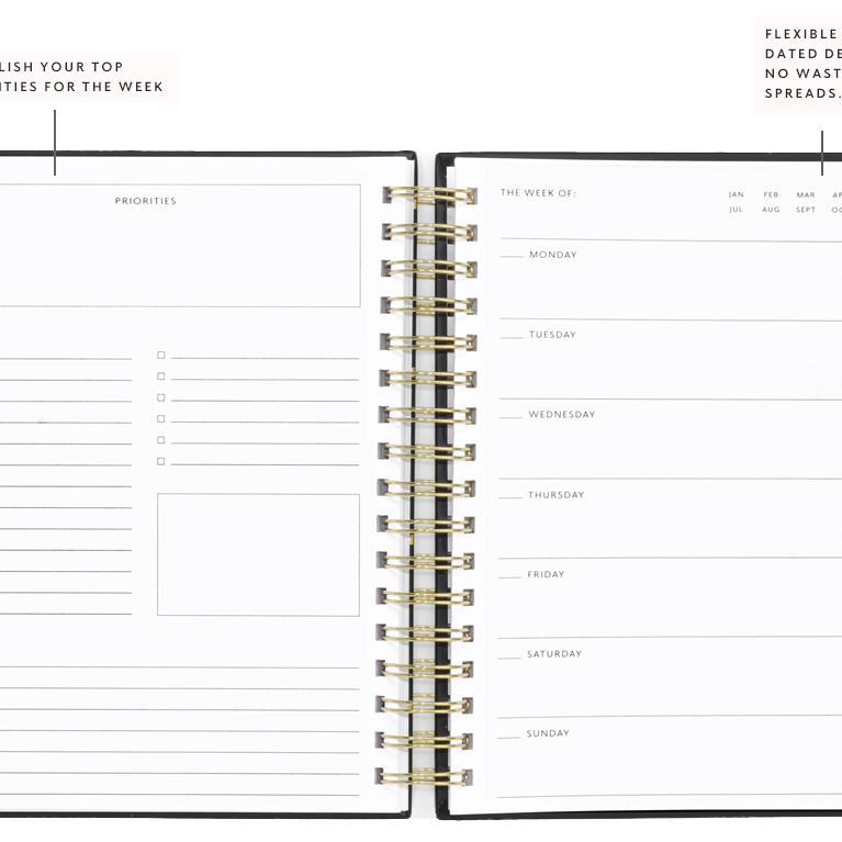Life is busy and can quickly overwhelm us with everything that needs to get done. We do a lot of “stuff”, but often feel the stress of a busy mind filled with a running to-do list. That is why we create planners that make it easy to get and stay organized, helping you go from scattered to focused - empowering you to stay in control of your schedule.