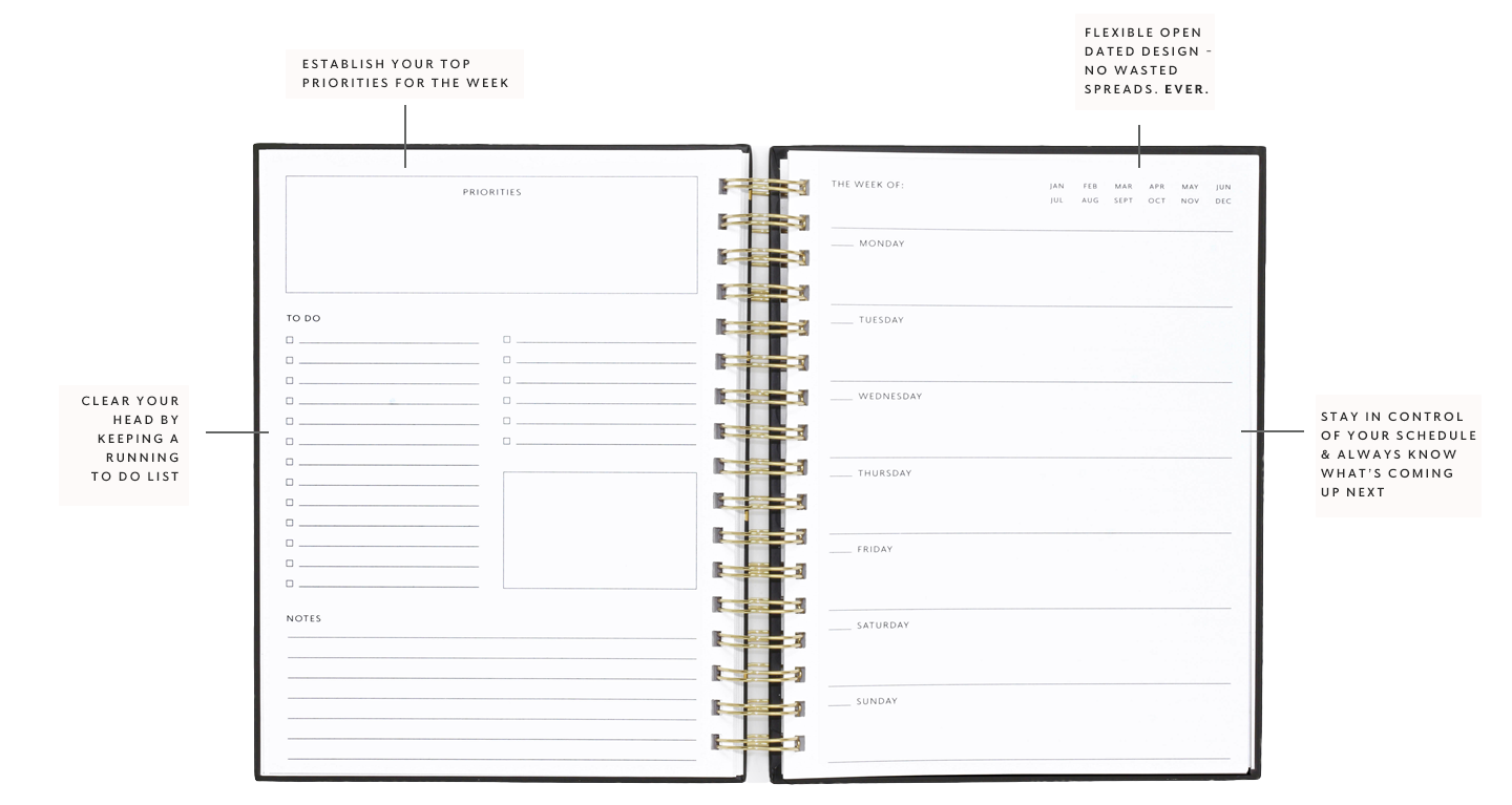 Life is more than overwhelm, writing down your to dos and visioning out your week is the key to becoming your most organized self. Use this planner to stay in control of your schedule, reduce the stress of having to remember it all and feel lighter as you cross off your tasks.